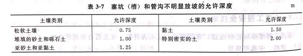 ①. 当土壤湿度正常、土质良好且无地下水影响,若开挖深度不超过表3-7的规定时,可不设支撑,也不必明显放坡,若开挖深度超过表3-7的规定,可根据土质和施工的具体情况参照表3-8的规定放坡。