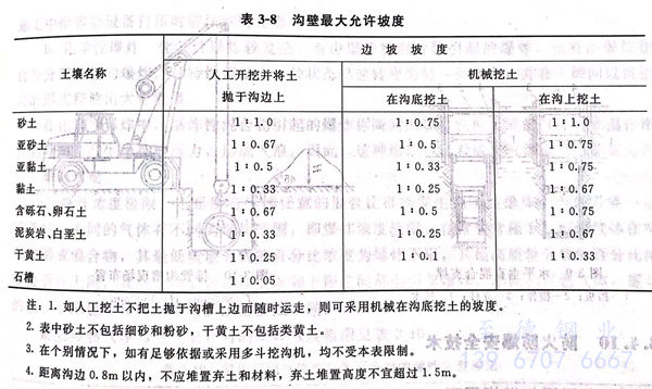 ⑧. 开挖管道沟槽或路堑时,要根据土质、地下水情况和开挖深度,确定合理的边坡坡度。