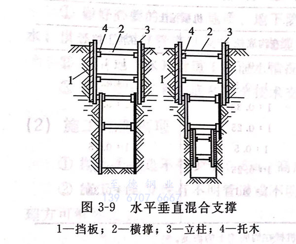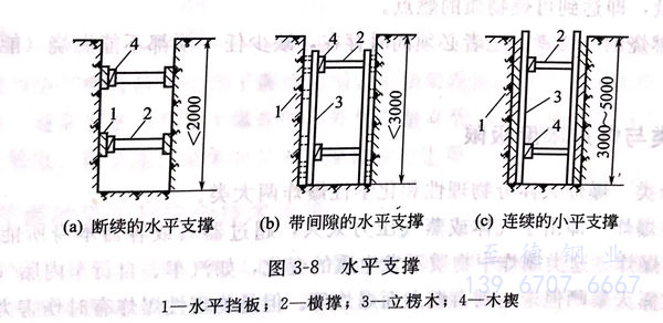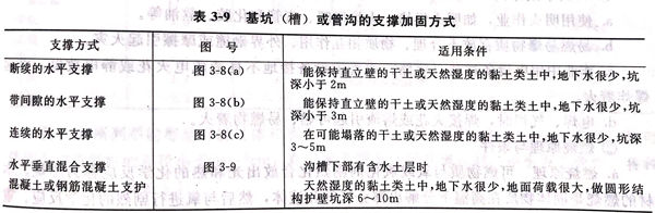②. 场地条件限制挖方不允许放坡时,则应采用支撑加固。支撑好一层下挖一层。支撑的加固方法可参照表3-9及图3-8、图3-9。