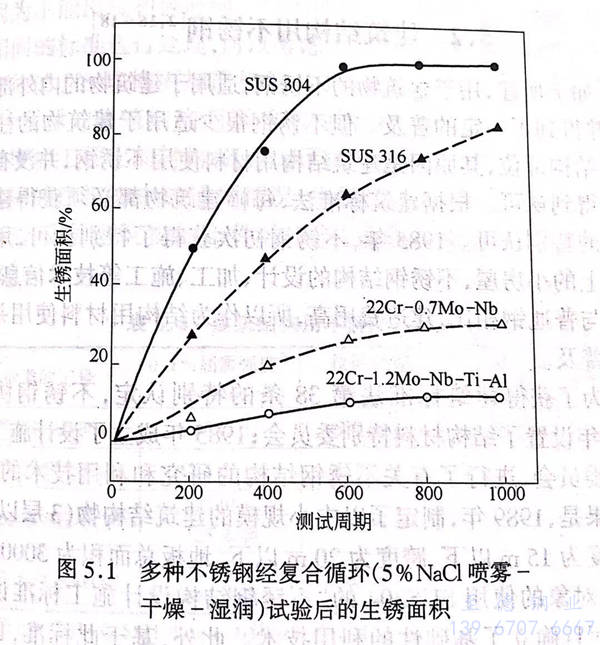 此外,不锈钢的裸露使用受到人们的喜爱,但对于在容易腐蚀的沿海地区的建筑物来说,SUS304不锈钢的耐大气腐蚀性不是很好,推荐使用SUS316不锈钢.但是,因为成本增高,所以在1982年研制开发了奥氏体不锈钢(NAS8AW,18Cr-8Ni-0.4Mn-0.4Mo-0.13N-S≤0.0010),这种钢与304不锈钢的成本相近,与316不锈钢的耐大气腐蚀性相近,并且添加氮、含硫低。之后,由铸模而成的22Cr-0.7Mo-Nb钢,通过作为建筑外部装潢材料特别是作为裸露使用的屋顶材料而引起了人们的注意。这种材料比用于汽车外部装潢的19Cr-0.5Cu-Nb钢(SUS430J1L)更加适用于严酷的环境中。1991年之前,研制开发出了如表5.2所示的20%~22%Cr-0.5%~0.9%Mo的高纯度铁素体系不锈钢。1989年建的千叶县的商品展览会场中也大量使用了没有涂饰的22Cr-0.8Mo-0.5Cu-Nb钢和22Cr-0.9Mo-0.5Cu-Nb钢。但是,在沿海地区,因为这些钢没有涂饰,容易生锈,所以各公司研制开发了如表5.3所示的钼含量(22%~24%Cr-1%~2%Mo)更高的铁素体系不锈钢,并从1994年以后,实际应用于屋顶上。把这些Cr-Mo铁素体系不锈钢和已有的奥氏体系不锈钢的耐大气腐蚀性加以对比试验(5%NaCl 喷雾→干燥→湿润),其结果如图5.1所示。也有铁素体系不锈钢比奥氏体系不锈钢的线膨胀系数小的情况,这特别适用于长尺屋顶,而且适用情况逐渐有所增加。