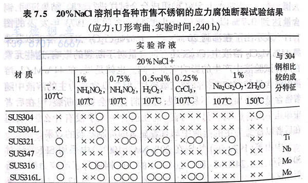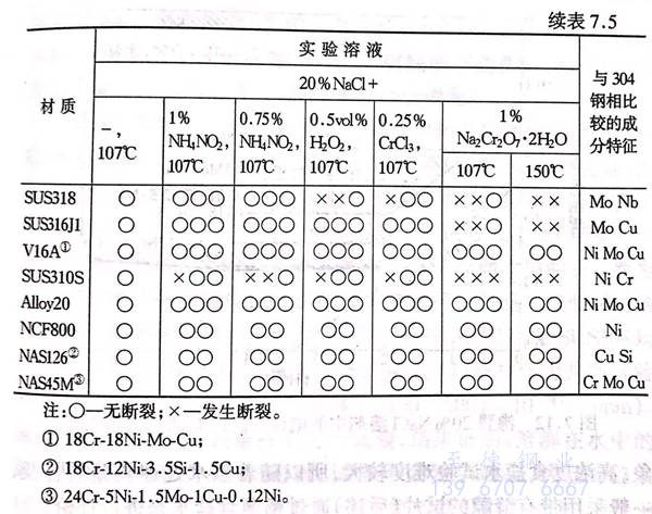 采用各种市售奥氏体不锈钢,添加各种氧化剂后在20%NaCl中进行试验,其结果如表7.5 所示。从表中可以看出:在市售钢当中,铜的效果也非常明显;还有,复合添加了钼和铜的316J1钢只有在1%Na2Cr2O7·2H2O的溶液中才会发生断裂;镍含量较高的V16A(18Cr-18Ni-Mo-Cu钢)、Alloy20、Incoloy800在任何条件下都不会发生断裂。这和实际使用效果是一致的。