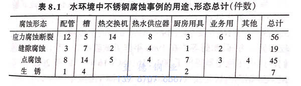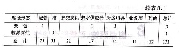 钝化膜的存在使不锈钢维持其耐蚀性。在不锈钢表面产生的局部集中腐蚀,最后形成孔状的现象叫做点腐蚀,Uhlig(1940年)认为点腐蚀是导致钝态破坏的原因。此外,在金属/金属之间、金属/非金属之间或附着物下出现缝隙时,缝隙的一部分或全部被腐蚀的现象叫缝隙腐蚀。在有机酸环境下也会出现这些腐蚀现象,在实际应用中,很多问题出现在以海水为代表的含有少量氯离子的环境中。正如第7章中图7.1所示,在化学工厂中的腐蚀事例中,点腐蚀和缝隙腐蚀事例是继应力腐蚀断裂之后出现最频繁的问题,特别是近几年来不锈钢的用途在水处理领域中不断扩大,因此成为一个非常重要的问题。金子等人在1990年对处于水环境中的不锈钢腐蚀事例进行了分析,表8.1是从其分析结果中摘录的按用途和形态所作出的总计结果。根据表8.1,点腐蚀和缝隙腐蚀占总数的49%,此外如果把大气中的生锈也看作从小孔开始,然后逐渐扩散,那么也可以把它看作为点腐蚀、缝隙腐蚀等局部腐蚀的一种,所以再加上大气中的腐蚀,那54%的腐蚀都属于这种腐蚀形态,它与应力腐蚀断裂一起成为不锈钢所面临的重大问题。