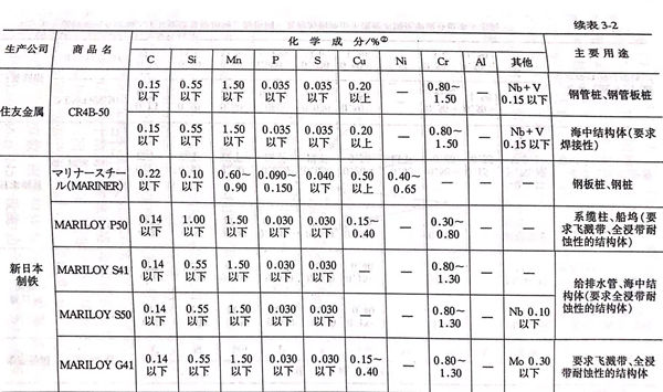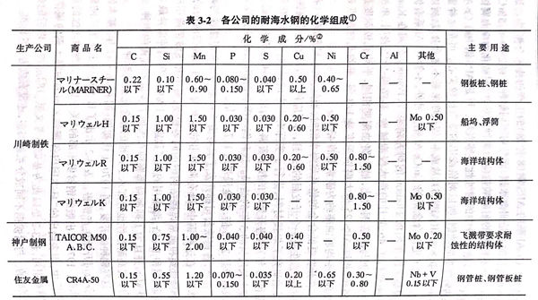 当然,各钢铁公司都开发了具有海水中耐蚀性和焊接性的耐海水钢。在这些钢中,既有海中用的也有海中和飞溅带两用的。把磷降低到和通常焊接结构钢的同等程度,海中和飞溅带两用的钢加入铜和1%Cr,海中用的钢多数定为1%Cr。因钢种而异最大是3%Cr,并且为了抑制局部腐蚀有添加了少量钼或镍的钢种,或者为了提高耐蚀性也有加人了其他的合金元素的钢种。