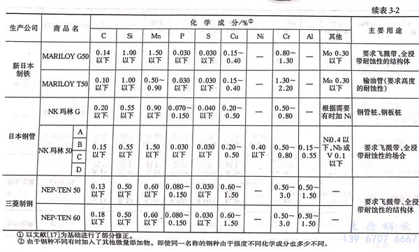 这些钢种的开发,到1970年代初期(昭和46~47年)基本结束,各公司开始生产销售。表3-2示出了日本现在正在生产的耐海水钢。1973年出版的钢材俱乐部的“关于钢材的腐蚀防蚀的资料”中,用表给出的“日本国内各钢铁公司的耐海水钢的规格”常常被引用,表3-2是以此为基础参考文献追加了以后的钢种制成的。与耐候钢不同成分系相当多,还没有成为JIS标准。