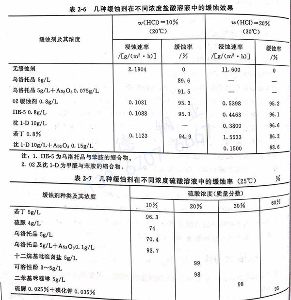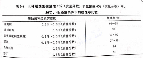 几种缓蚀剂在不同浓度的盐酸溶液中的缓蚀效果见表2-6, 几种缓蚀剂在不同浓度的硫酸溶液中的缓蚀率见表2-7, 几种缓蚀剂在盐酸与氢氟酸混合酸中的缓蚀率见表2-8。
