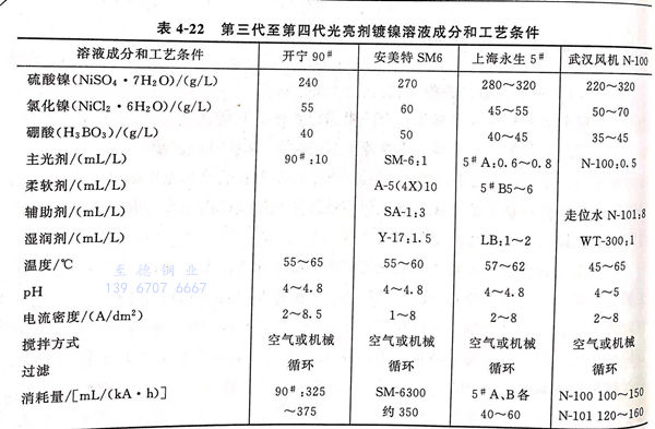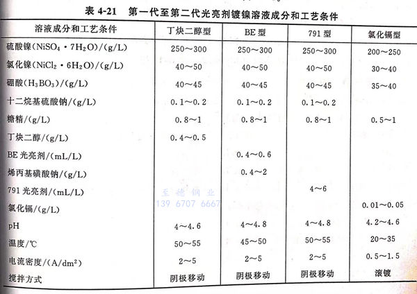 光亮镀镍溶液成分及工艺条件见表4-21、表4-22。
