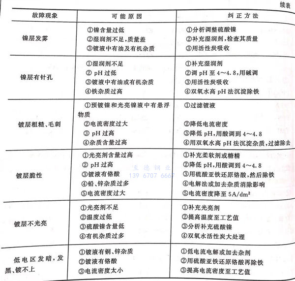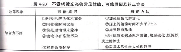 不锈钢镀光亮镍常见故障、可能原因及纠正方法见表4-23.