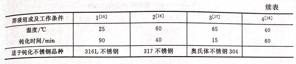 不锈钢柠檬酸钝化工艺具有环保性、安全性、通用性,操作简单,维护方便。费用低廉,完全符合可持续发展的要求,应用前景广阔,值得广泛推广。其配方及工艺条件见表6-6。