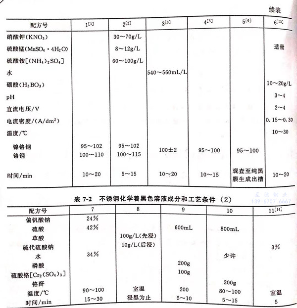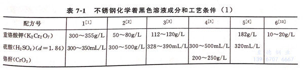 不锈钢化学着黑色溶液成分和工艺条件见表7-1和表7-2.