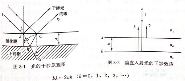 当不锈钢表面氧化膜的折射率 n 一定时,干涉色主要取决于氧化膜的厚度h 和自然光入射角度i。膜的厚度 h 与颜色的关系见表8-3。