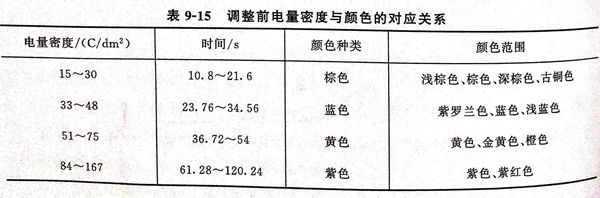 不锈钢电化学着彩色酸性溶液成分和工艺条件见表9-9。配方3(见表9-9)的说明 。本配方由焦作工学院机械系 南红艳、张跃敏、尹新斌、徐可提出。