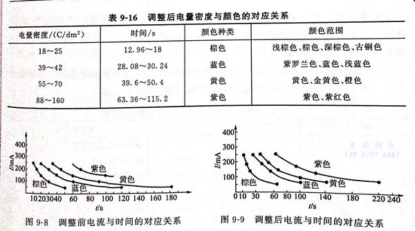 见图9-7,由图可见,每一种颜色的电流与时间大致呈反比例关系。实验发现,每一个试样上,只要达到一定的电量密度,就会出现不同的颜色,就可采用控制电量来达到不锈钢着色的目的。