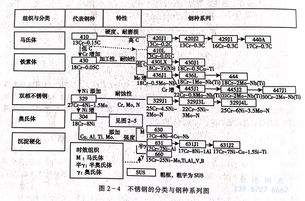 不锈钢有几百个钢种,性能各异。不锈钢目前常用的分类方法是按钢的组织结构特点和钢的化学成分特点或两者结合的方法来分类。如不锈钢分为:铁素体不锈钢、奥氏体不锈钢、马氏体不锈钢、双相不锈钢和沉淀硬化不锈钢或时效硬化型五大类(见图2-4、图2-5);或铬不锈钢和铬镍不锈钢两大类。