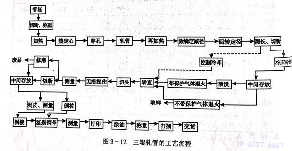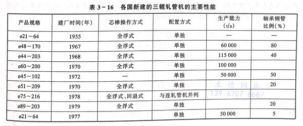 三辊轧管工艺是把穿孔后的荒管在三个呈120°配置的轧辊和一根长芯棒之间进行旋转前进碾轧的,所以可以生产尺寸精度高、表面质量好的产品。而且三辊轧管机具有便于调整、容易变换规格、灵活性高等特点。适合小批量多品种的不锈钢管生产。主要用于生产厚壁钢管。产品的外径与壁厚比可在4~18的范围。生产工艺过程包括管坯准备、加热、定心、穿孔轧管、再加热、定减径、回转定径、冷却和矫直、切头和探伤等工序。生产工艺流程见图3-12,三辊轧管机在生产D/S=15~4.5的钢管时采用全浮动式芯棒,在生产D/S=4.5~3.的厚壁管时采用回退式芯棒。三辊轧管机一般都配置5~14架定径机(或减径机、张力减径机)和二辊式回转定径机。各国新建的三辊轧管机的主要性能见表3-16。