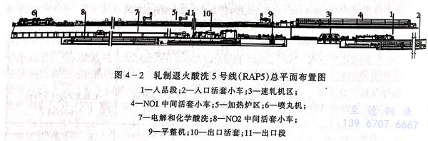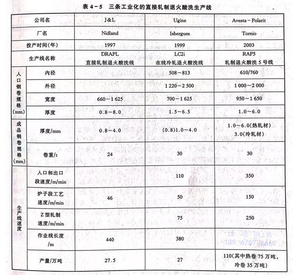 不锈钢冷轧带钢轧制退火酸洗平整连续生产线是借鉴碳钢冷轧技术现代化模式,将传统的冷轧不锈钢带生产工艺中各自独立的四个工序,即热轧带钢退火酸洗、冷轧、冷轧带钢退火酸洗和平整组成一条连续生产线,其目的就是以高效生产来大力降低成本,并能完成控制产品的质量。目前世界上有3个工厂实现了这种生产方式,见表4-5。早在1990年阿维斯塔公司的尼比厂曾在退火酸洗机组的入口侧安装了一台“Z”型冷轧机,实现了冷轧不锈钢带钢的部分连续生产,但由于当时手段不够完善,成本效益不明显,产品表面质量也不尽如意。后来美国J&L公司的米德兰厂在设计安装这种连续生产线时作了一些改进,年产量可达25万吨,1997年投入工业生产,这是世界上第一条冷轧带钢轧制退火酸洗平整连续生产线,称之为“直接轧制退火酸洗生产线(DRAPL)”。但在生产过程中发现表面质量不甚理想,这是因为热轧带钢进入轧机轧制前仅经过机械除鳞,因而表面氧化铁皮没有完全除净所致。1999年法国Ugine公司的伊斯贝格厂投产了一条新的轧制退火酸洗线,这条生产线的特点是:①. 除鳞装置进行了改进,它包括破鳞机(机械除鳞)、喷丸机和酸洗槽,酸洗采用串级式的浅槽酸性,设3个酸洗槽,另有刷洗、漂洗槽和烘干机;②. 采用了3架Z型轧机进行冷轧,Z型轧机是以森吉米尔轧机专利为基础的18辊轧机,其特点是可以承受较大的单位压力,实现较大的压下量以保证带钢表面质量的要求;③. 酸洗工艺有自己的专有技术,不使用硝酸,以避免氨氧化物的排放,从而改善了环境。④. 生产的冷轧不锈钢304 2B表面质量良好,粗糙度小于0.2,μm,好于欧洲市场2B表面加工的要求,这条生产线称为“在线轧制退火酸洗线(LC2i)”。值得注意的是Avesta-Polarit公司芬兰的托尼奥厂将于2003年投产出界上最大的轧制退火酸洗联合生产线,规模可达110万吨,其中75万吨是热轧带钢卷,35万吨是冷轧带钢卷。轧制区由3台6辊轧机组成,轧机带侧支撑辊和侧支撑轴承以稳定工作辊,采用液压AGC中间辊移动和弯曲技术,轧机后面是一个脱脂区,设有高压水系统,碱脱脂、刷洗设备、漂洗和干燥剂;酸洗区由中性盐电解酸洗、中间漂洗、混合化学酸洗、5级Cascade最终清洗和干燥设备组成;平整机既可进行平整道次又可进行压下道次,根据产品方案可按二辊或四辊模式操作,由于在生产线上作业,因此平整机装有在线带钢卷快速换辊装置,设备总平面位置见图4-2。