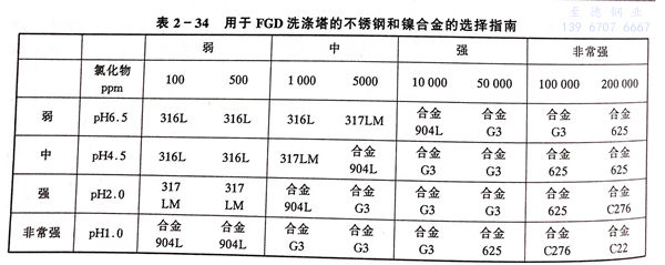 在烟气脱硫装置中所使用的耐蚀材料涉及到一般不锈钢、高性能不锈钢以及镍基耐蚀合金,见表2-33.可根据介质条件进行合理选择。通常按表2-34所列原则选择烟气脱硫不同装置的耐蚀材料。