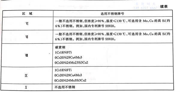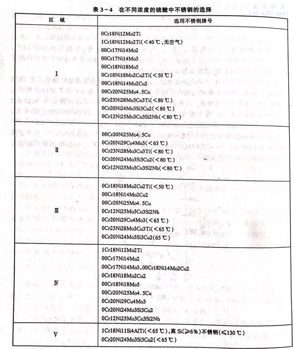 硫酸对不锈钢的腐蚀,与酸的浓度和温度有关。通常,在纯硫酸中不选择不含Mo的Cr-Ni奥氏体不锈钢作为结构材料。根据硫酸的腐蚀性和不锈钢的耐蚀性,可按图3-4划分的区域进行合理选用。通常,316不锈钢是在硫酸介质中可应用的最低牌号,一些钼、铜复合的高性能不锈钢仅能用于80℃以下的各种浓度的硫酸中,在高于80℃,90%以下的硫酸中,只能选用镍基或铁镍基耐蚀合金。在高温高浓硫酸(90%~98%)中,高硅约6%)并含钼、铜的不锈钢具有优良的耐蚀性。在图3-4中各区域可选用的不锈钢牌号见表3-4。