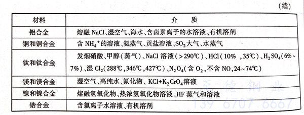 只有在特定的腐蚀介质中含有某些对发生应力腐蚀有特效作用的离子、分子时才会发生应力腐蚀。这种特定的腐蚀剂并不一定要大量存在,而且往往浓度很低。表1.5列出了一些金属和合金发生应力腐蚀的特定介质。
