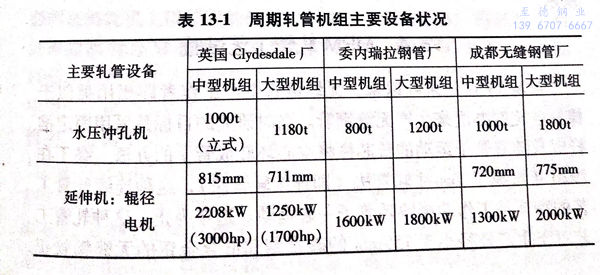 在1958年前后除了Phoenix 钢铁公司的这一套采用Calmes轧管工艺的周期轧管机组以外,还有英国 Clydesdale(1947年、1956年)、委内瑞拉钢管公司(1958年)和我国的成都无缝(1958年、1965年)等几套周期轧管机组投产。其主要设备状况如表13-1所示。
