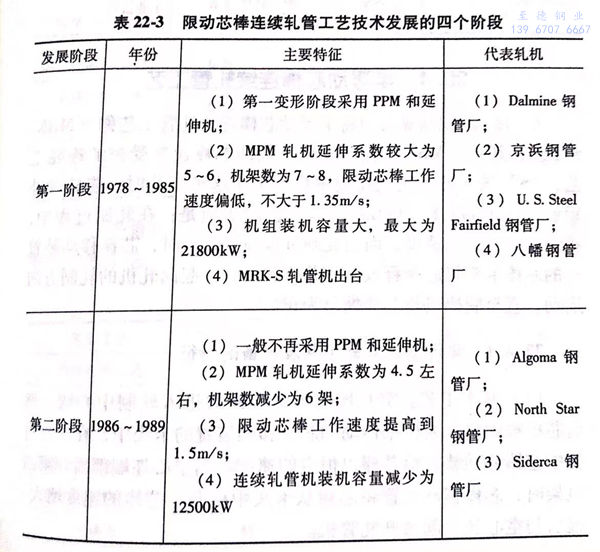 不锈钢管限动芯棒连轧管工艺的技术发展史应溯自1890年,Pfeiffer在一篇文章中写道:“1890年发明家Heckert 申请了连轧技术专利,该技术采用十架两辊高速轧机固定芯棒轧制空心管坯。可见在Calmes 多机架轧管机问世前80年,就已有了雏形。”1968年A.H.Calmes 取得了MPM连轧管工艺的权利,10年后,第一套MPM连轧管机在Dalmine Bergamo 钢管厂投产,到2003年12月天津无缝不锈钢管厂三辊式限动芯棒连轧管机投产,已经历了整整25年的时间,和全浮动芯棒连轧管技术的发展相比,这种工艺技术的发展显得快多了。这25年的发展历程可划分为四个阶段,如表22-3所示。