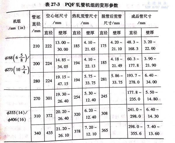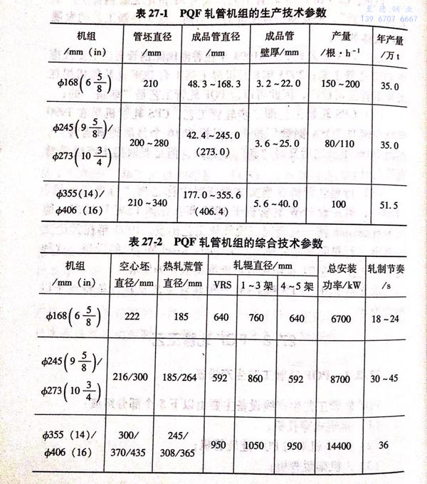 现将 φ168mm、φ245mm/ф273mm 及 φ355mm/ф406mm PQF轧管机组的生产技术参数、综合技术参数以及变形参数分别列表27-1~表27-3予以说明。