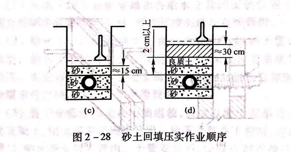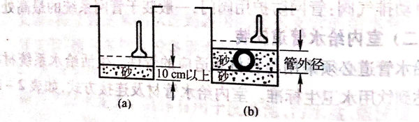 a. 室内地坪±0.000以下的管道敷设应分两段进行。先进行地坪±0.000以下至基础外墙段的铺设;待土建结束后,再进行户外连结管的铺设。铺设管道的沟底应平整,不得有突出的尖硬物体,沟底应铺100mm厚的砂垫层。埋地管回填时,先用砂土或颗粒不大于12mm的土壤回填至管顶上侧300mm处,以夯实后方可回填原土,其埋深不宜小于300mm,如图2-28所示。