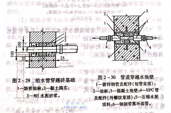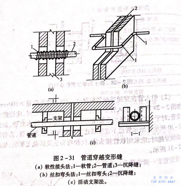 b. 引入管在穿越基础预留时,应留基础沉降量≥100mm,如图2-29所示。引入管穿越地下室、地下水池池壁时,应设防水套管,对于有均匀沉降及受振动的墙体,应设柔性防水套管,如图2-30所示。给水管道不宜穿越建筑物的伸缩缝、沉降缝,若管道必须穿越时,应采用软性接头法、丝扣弯头法及活动支架法,如图2-31所示。