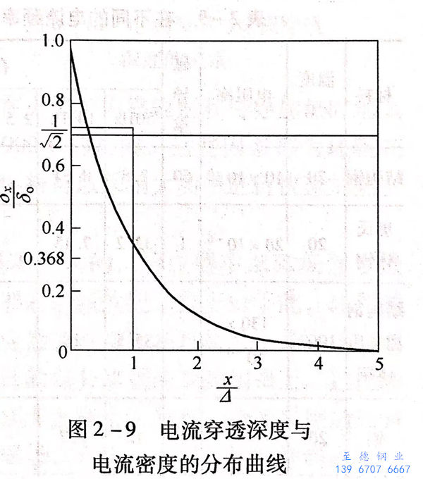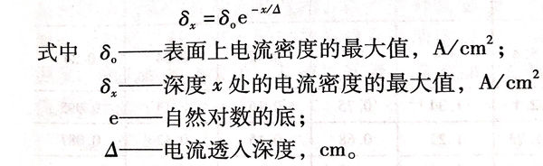 由集肤效应可以看出,采用交变电流时,电流只流过导体的表面层。电流频率越高,电流通过的表面层越薄。为了简化整个感应加热的计算,引入电流穿透深度的概念,即导体某一深度处的电流密度为其表面电流密度的 1/e = 1/2.718 = 0.368 时,这一深度 △ 即为电流穿透深度(图 2-9),可用下式确定: