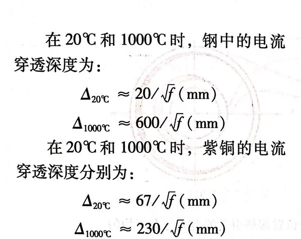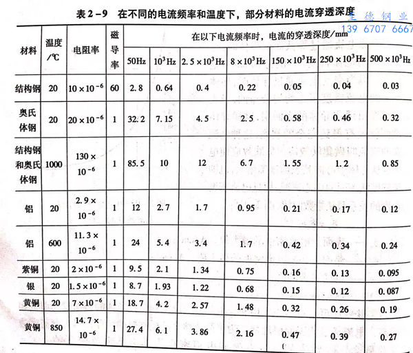 表2-9为在不同的电流频率和温度下,部分材料的电流穿透深度。