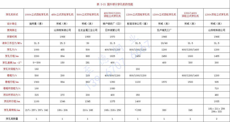 表2-20为国内外部分挤压机与穿孔机的配用情况。 表2-21为国外部分穿孔机的能力。