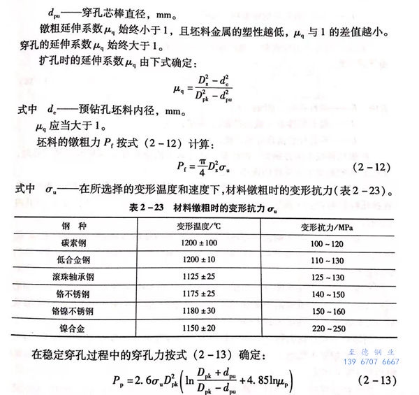 对于碳素钢和合金钢,坯料和穿孔筒内衬直径之差6~15mm;