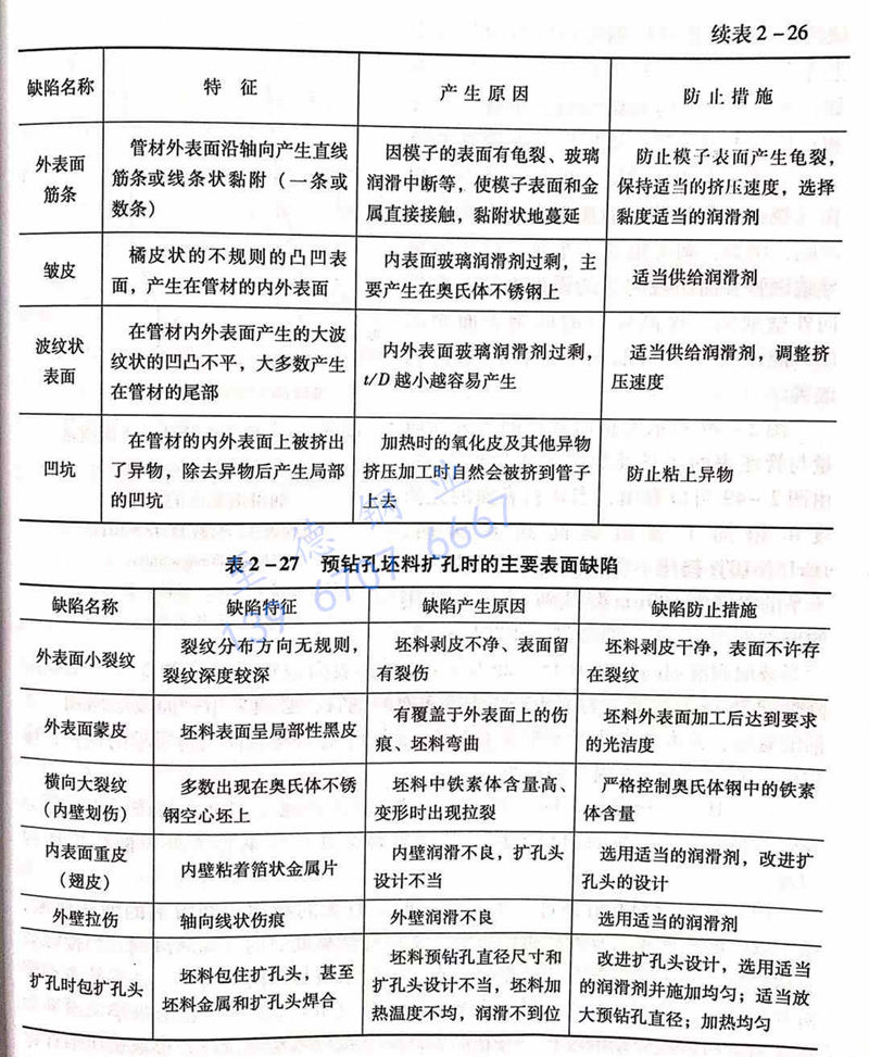 的主要表面缺陷,表2-27为预钻孔坯料扩孔时的主要表面缺陷。