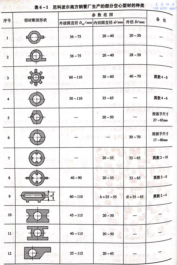 用热挤压法生产的各种型材如图6-2所示。尼科波尔南方不锈钢管厂的3150吨挤压机生产的部分异型材如图6-3所示。尼科波尔南方不锈钢管厂生产的部分空心型材和实心型材的种类分别见表6-1和表6-2。