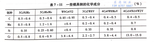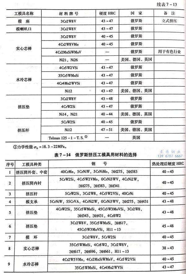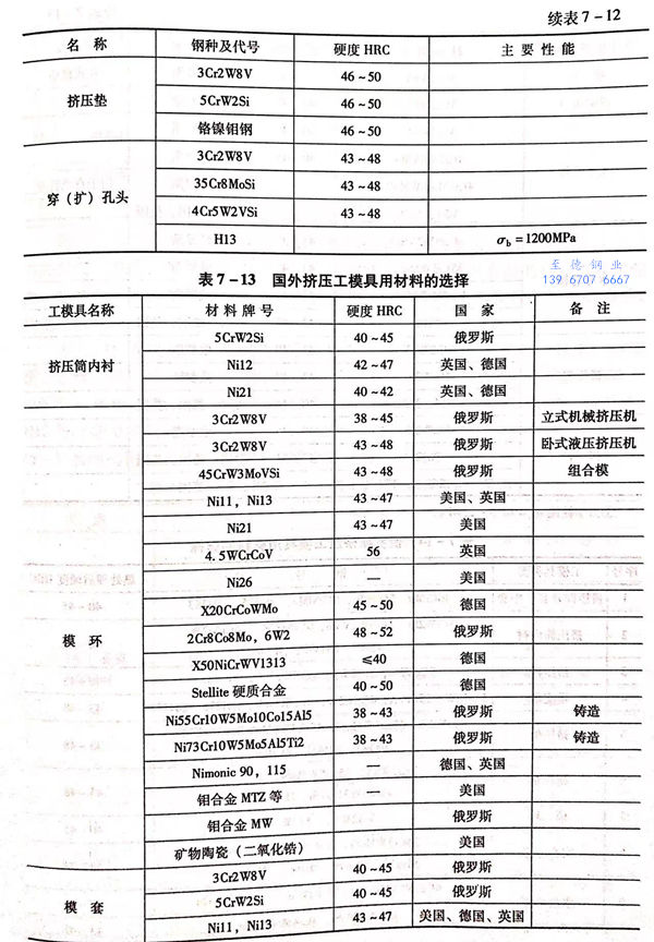 其他的难熔金属,如钶、钽和钨同样具有模具特性。钽和钨具有比钼高的再结晶温度,但钽的价格高,而钨加工困难,都难考虑用作挤压模具。钶的再结晶特性与钼相类似,且钶合金能够达到与钼合金类似的高温性能,而价格可能会稍比钼合金便宜。因此,钶有可能作为热挤压模具的材料。此外,金属陶瓷和钨虽然加工困难,但用于制作组合挤压模的模环,可以达到较高的使用寿命,必要时可做此选择。一些模具钢的化学成分见表7-11,俄罗斯一些挤压和穿孔工模具材料选用范例见表7-12,国外挤压工模具用材料的选择见表7-13和表7-14.