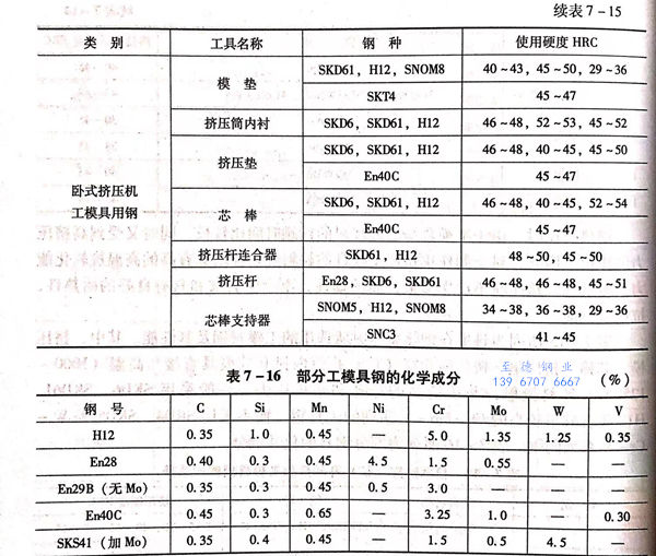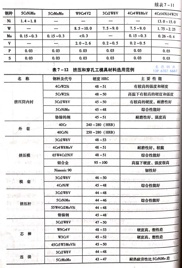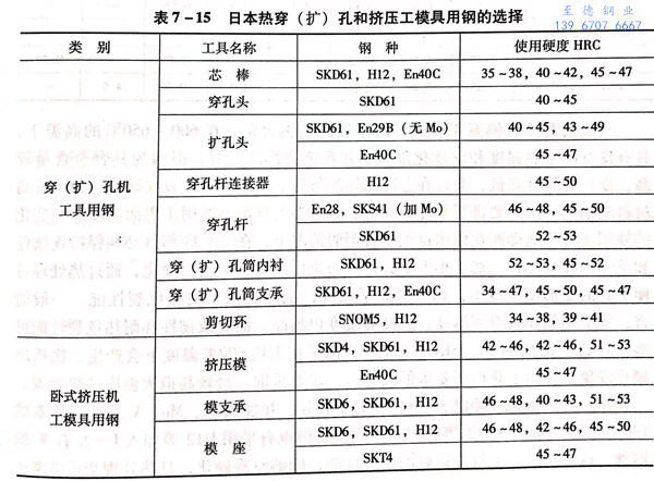 表7-15所列为日本在钢热挤压时所选用的工模具钢及其性能。其中,挤压模、芯棒、挤压垫、挤压筒和穿(扩)孔筒内衬套等模具直接与高温(1000~1250℃)坯料接触,并承受高的穿孔和挤压压力,一般采用SKD6、SKD61、H12等含硅量较高的Cr-Mo-V系列的工具钢,而不采用SKD4、SKD5等W-Cr-V系列的钢。表7-16所列为部分钢号的化学成分。