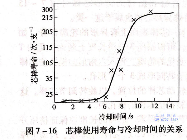图7-16所示为芯棒使用寿命与冷却时间的关系。由图7-16可知芯棒的冷却时间越长,冷却得越充分,其使用寿命越长。图7-17所示为德国SMS公司设计制造的60MN(6000t)卧式管棒型材挤压机带有内水冷装置的芯棒系统结构。图7-18所示为尼科波尔南方不锈钢管厂3150吨钢管挤压上采用的水冷芯棒结构。