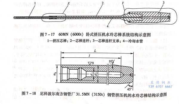 在现代的管型材卧式挤压机上,比较普遍地采用水冷芯棒,其冷却水是通过沿芯棒水平轴心钻孔(前端有50~100mm未钻穿)进入,实现循环水冷却芯棒。使用结果表明,当钻孔的直径等于芯棒直径的三分之一时,将得到满意的冷却效果,此时,冷却系统水的压力不能低于100kPa(约10个大气压)。