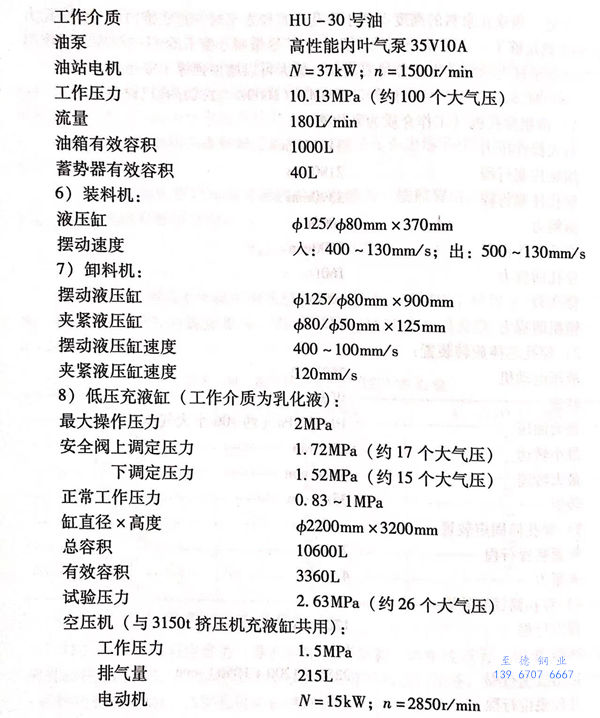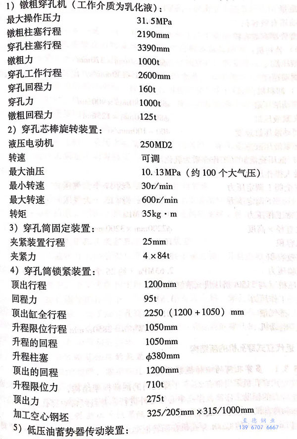 6. 31.5MN(3150t)挤压车间10MN(1000t)立式穿孔机设备性能: