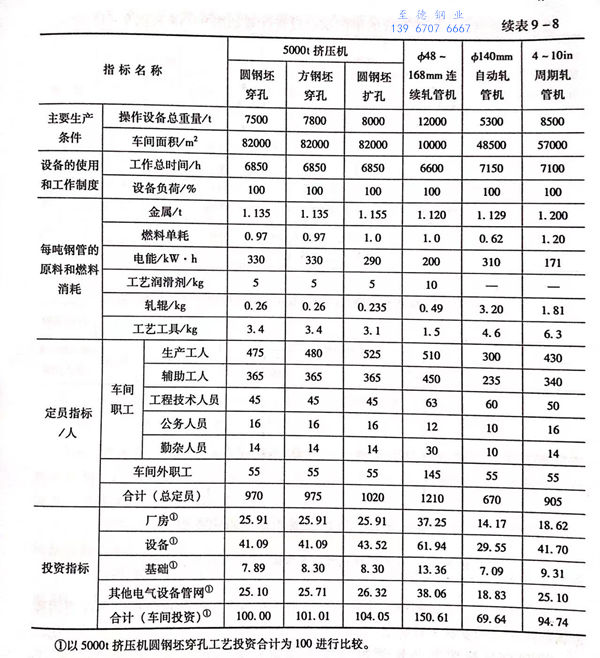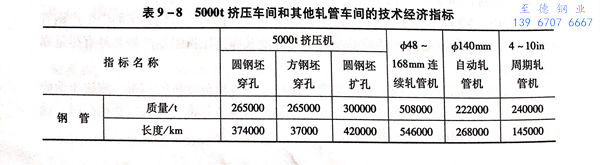 5000吨挤压车间和其他轧管车间的技术经济指标见表9-8(根据尼科波尔南方钢管厂原始资料整理,供计算技术经济指标用)。