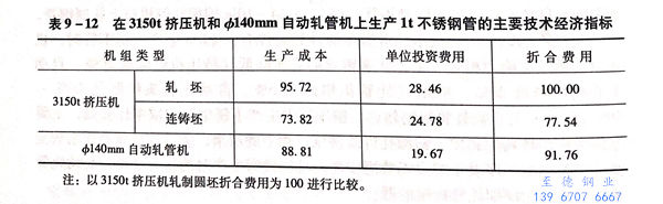 由表9-9和表9-10可以看出,在挤压机上按方案I生产碳素钢管和在φ168mm连续轧管机上生产碳素钢管最为有利。采用连铸坯时,用挤压法生产不锈钢管特别有效。
