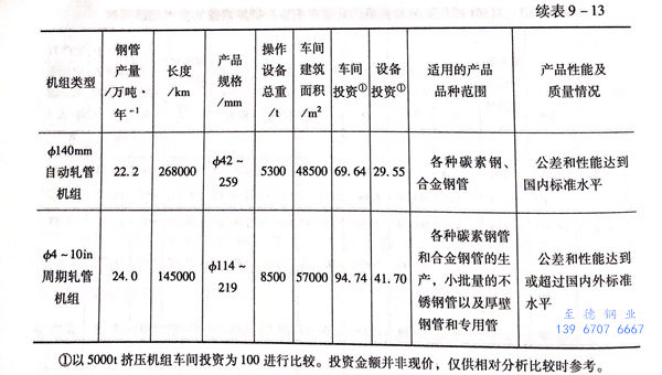 通过上述分析将各种不锈钢制管机组的主要工艺配置、应用范围、产品规格及其质量和性能、技术经济指标进行了总结,具体见表9-14.