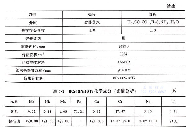 某甲醇厂一台水煤气废热锅炉(以下简称“废锅”)管程的介质是由H2、CO、CO2、H2S、NH3、H2O等组成的水煤气,水从锅炉补水口进人废锅壳程,并在其内变成蒸汽后,再由蒸汽出口排出,废热锅炉技术特性见表7-1。壳程的最高工作压力和温度分别为3.4MPa、242℃,管程的最高工作压力和温度分别为6.28 MPa、241℃.管子采用321不锈钢材料,厂家提供的321不锈钢材料的化学成分见表7-2,管板采用20MnMo材料。换热管和管板管孔的连接方式采用强度焊十密封胀。