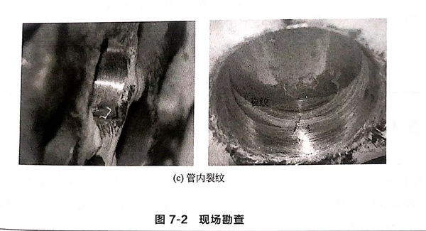 首先对不锈钢管板进行着色探伤,未发现裂纹,如图7-2(a)所示。其次,对筒体进行了检查,未发现裂纹、腐蚀等现象,如图7-2(b)所示。经仔细观察,泄漏水珠是从换热管内流出的,因此,基本可以确定裂纹出现在换热管上。经渗透检测和打磨,开始在管内壁未发现裂纹,但经过渗透和打磨之后,出现树枝状裂纹;随着打磨的进行,裂纹越来越清晰,并且裂纹宽度由管内向外逐渐增加,如图7-2(c)所示。因此,可以初步判断裂纹起源于管外壁,向内部扩展。