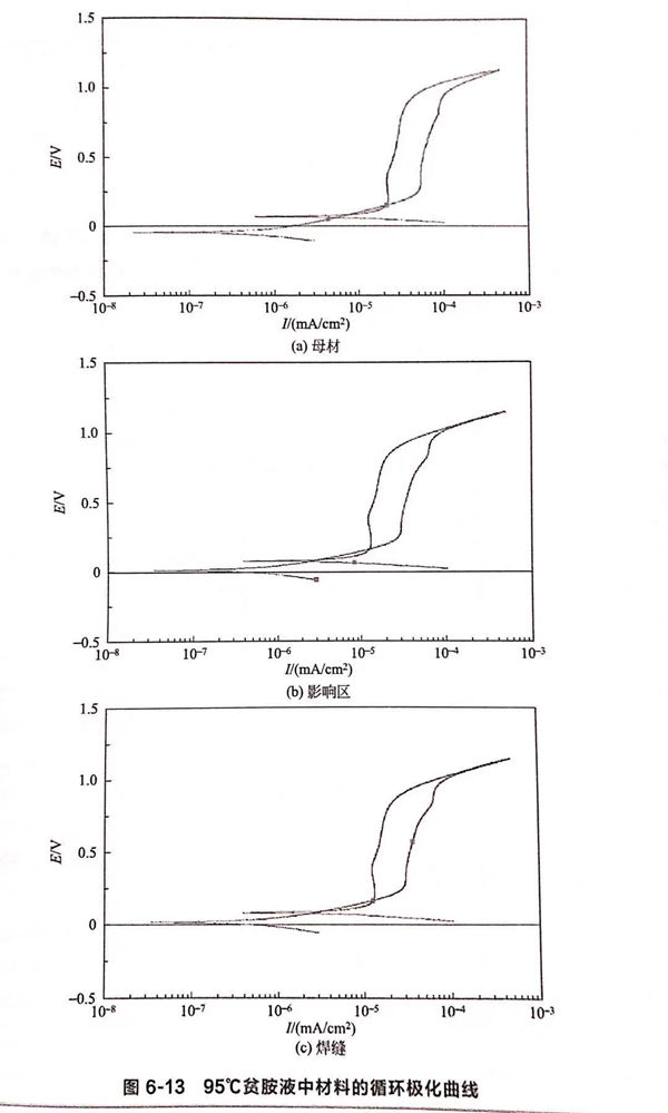图6-13是在贫胺液中测得的材料的循环极化曲线,得到的击破电位、保护电位和自腐蚀电位数值列在表6-5中。