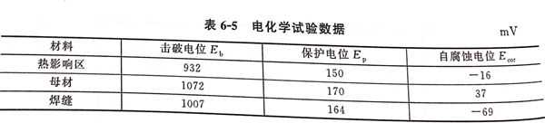 比较三种材料的击破电位和保护电位值发现,母材>焊缝>热影响区。因此,它们的耐腐蚀性能从高到低分别是母材>焊缝>热影响区。