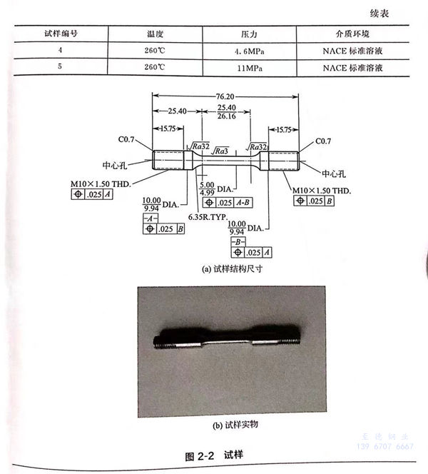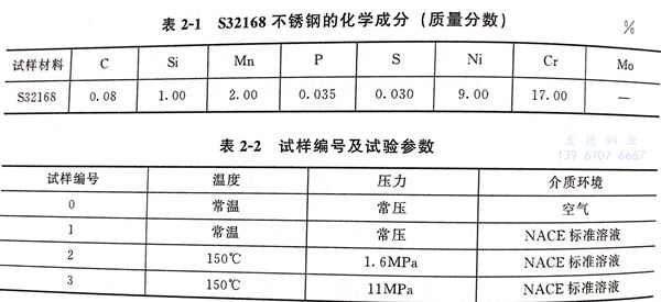 以S32168不锈钢为试验材料,材料的化学成分列于表2-1。试样加工成标距为25.4mm、直径为5.00mm的圆柱状,试样几何形状如图2-2(a)所示,实物如图2-2(b)所示。试验之前,试样先用400#、200#、2000#三种不同规格的砂纸依次沿着纵向和横向交替打磨。打磨完成后,将试样依次放入乙醇和丙酮溶液中进行超声清洗,用去离子水冲洗并且吹干。试验溶液用NACE标准中规定的分析纯氯化钠、乙酸和去离子水配制,其中氯化钠的质量分数为5%,乙酸的质量分数为0.5%,溶液的pH值在3~4之间,试样编号及试验参数见表2-2.试验是在美国CORT-EST公司研制的慢应变速率应力腐蚀试验机上进行的,拉伸速率为1.9×10-6s-1.每次试验结束,都会得到一条应力-应变曲线和断裂时间,随之可以得到最大应力、断面收缩率和伸长率。将拉断的试样先后用去离子水和乙醇清洗并吹干,用扫描电镜(SEM)观察断口形貌,然后将样品沿标距段纵剖,观察裂纹路径及深度方向的生长情况。