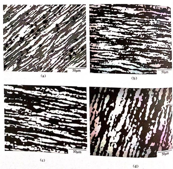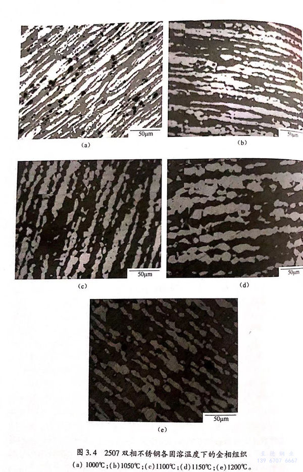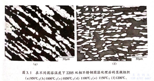 对2205双相不锈钢进行不同温度的固溶处理会导致2205双相不锈钢两相组织的改变,进而导致其性能的差异,图3.1是在不同温度下2205双相不锈钢固溶处理后的微观组织。