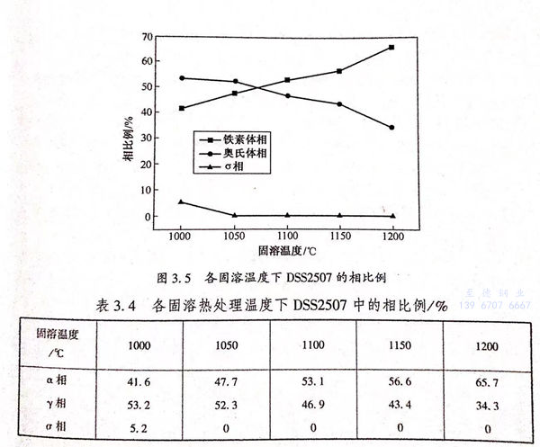 图3.4中深色组织是铁素体α相、浅色组织是奥氏体γ相。从图3.4可知奥氏体γ相首先表现为长条状,随着固溶处理温度的升高而逐渐变短,变成岛状分布在基体铁素体上面。从图3.5及表3.4中给出的相比例测量结果能够获得钢中铁素体α相量随固溶热处理温度的升高而上升,奥氏体γ相体积分数随着固溶温度的上升而下降,这是由于在较高的固溶温度下2507双相不锈钢呈现出的组织为单一的铁素体,随固溶热处理温度的降低铁素体逐步转化为奥氏体组织,即固溶热处理温度的升高导致奥氏体逐渐转变为铁素体组织。从图3.5可以看出当固溶热处理温度在1000~1050℃之间时奥氏体y相比例减小的比较缓慢,随固溶热处理温度的升高奥氏体γ相含量减少的趋势加快,这是因为2507双相不锈钢中的氮元素是奥氏体形成元素,在较低固溶温度下抑制了奥氏体相向铁素体相的转变,而固溶热处理温度的升高会使N元素稳定奥氏体相的作用逐渐减弱,进而导致奥氏体γ相向铁素体α相转变速度加快。