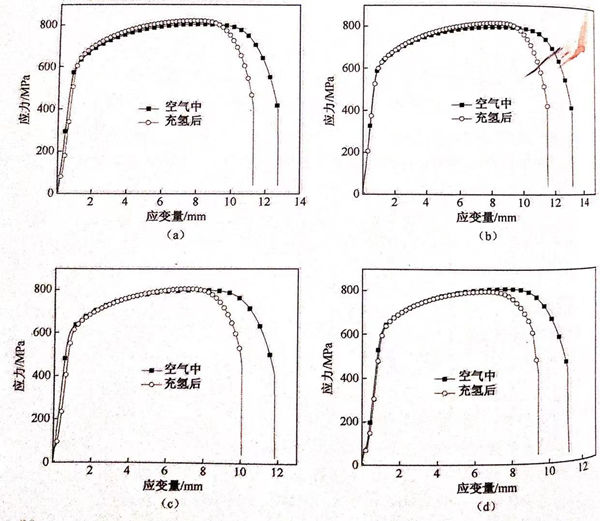 比较同一热处理温度下未充氢试样与充氢试样的拉伸曲线,所有试样充氢后拉伸伸长量较未充氢时明显下降,1050℃试样下降1.65mm,且随温度的升高,伸长率的差变大,1200℃的试样伸长率已经下降1.76mm。