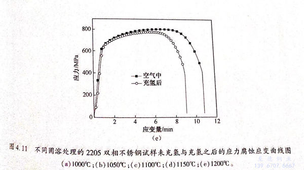 2205双相不锈钢未充氢后在0.5mol/L H2SO4溶液应力腐蚀拉伸参数如表4.4所列,由表4.4可知,不同固溶温度处理后的双相不锈钢具有不同的应力腐蚀参数。